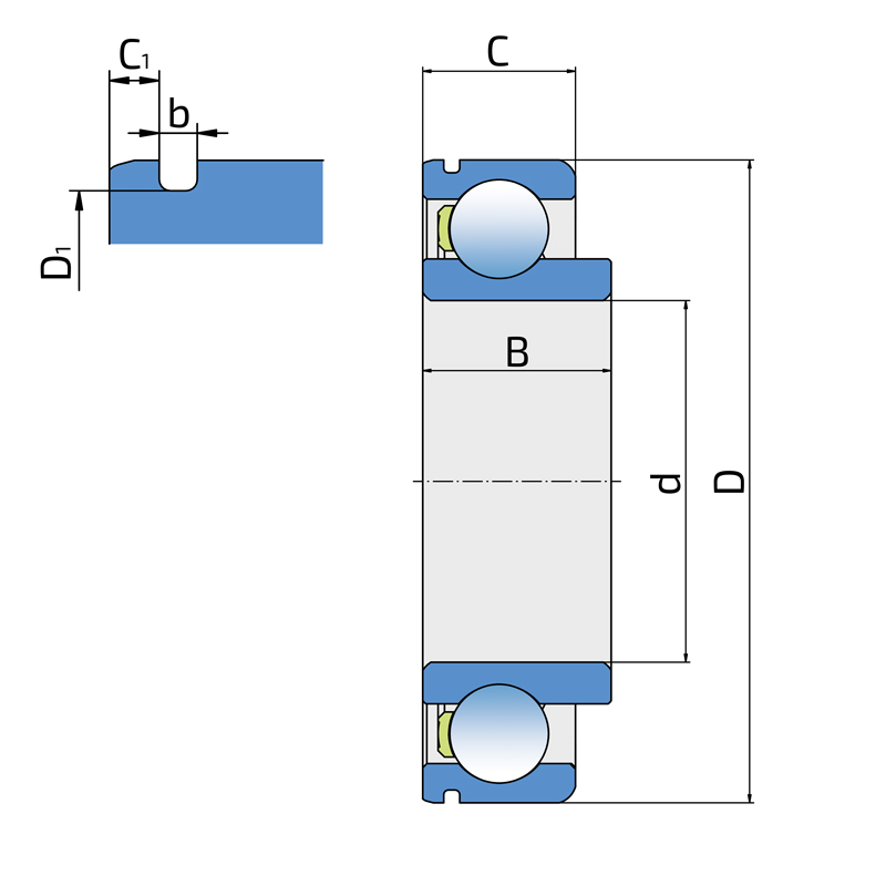 | C1 | Distance from outer ring side face to snap ring groove | 2.6 | mm |